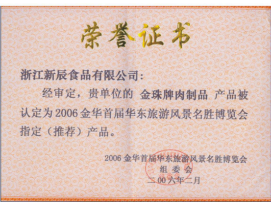 金珠牌肉制品產(chǎn)品被認(rèn)定為2006金華首屆華東旅游風(fēng)景名勝博覽會(huì)指定(推薦)產(chǎn)品。
