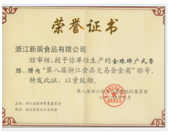 金珠牌廣式香腸、臘肉“第八屆浙江食品交易會(huì)金獎(jiǎng)”稱號(hào)