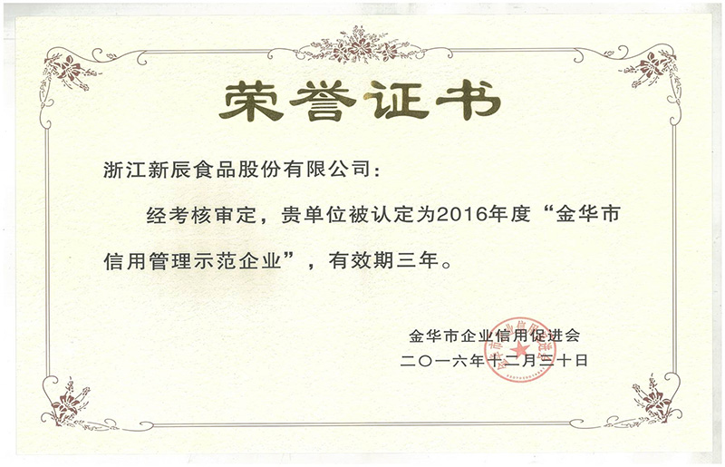 被認(rèn)定為2016年度“金華市信用管理示范企業(yè)”